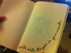 There is a page that says “Write with the pen in your mouth”. We decided to write our names with pen in our mouths. Nash went first and he didn’t do that badly.