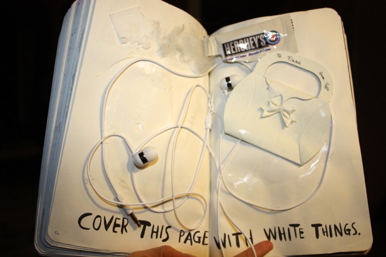 Now this is a rather random page of white things. The objects include: earphones (don’t worry they suck), puppy fur, tissue, chocolate, a little paper box.
