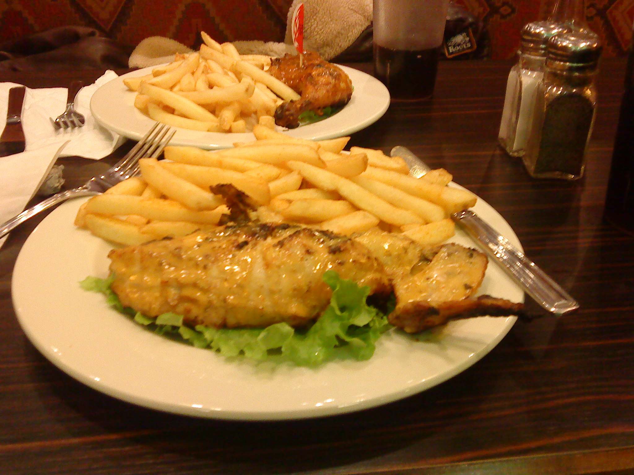 Their menu looks like a regular grilled chicken menu until you order. Then you are offered a selection of sauces from garlic, mild, hot which your chicken will be cooked in. I got mild quarter chicken breast with a side of Peri-Peri fries. Nash ordered the hot sauce with a side of regular fries.