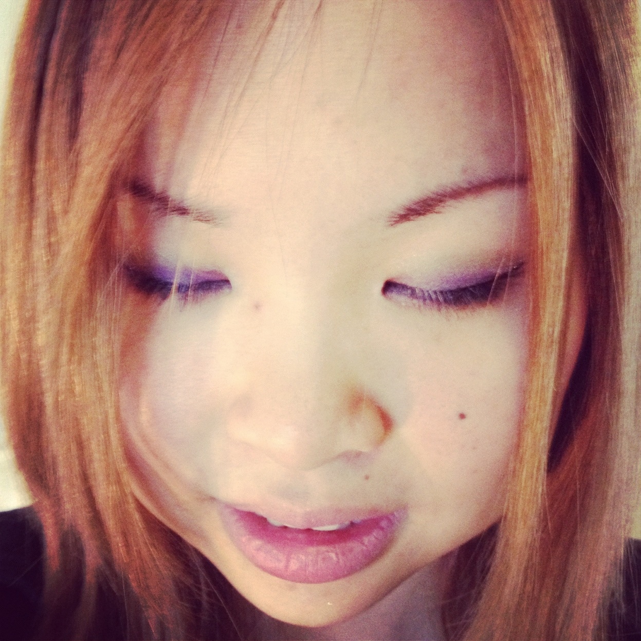 Here is Look #1. It’s a very pale look. I used a pale purple and a pale gold eye shadow. Lip gloss is also a light pink. I have very small eye lids so it’s hard to see when my eyes are open, so here’s a picture with both. These are taken with my iPhone. When time allows, I’ll use the DSLR. Let this be a month full of colour!