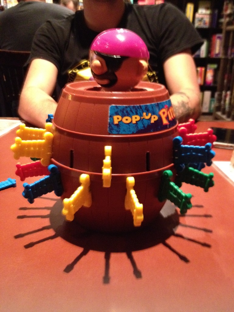 Pop-Up Pirate did not require any brain power either. However, the first time through it scared the hell out of me when Nash poked a sword through and sent him flying. It was unexpectedly loud as it popped up.