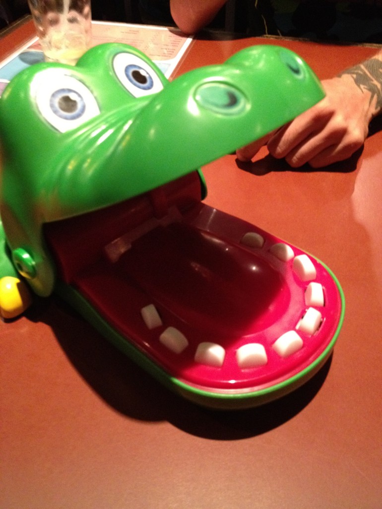 It’s one of those games I really wanted to try as a kid because of those enticing YTV ads. It’s actually not that fun when you’re a grown up though because there’s a way of pushing down on the teeth to ensure that he won’t ensnare you.