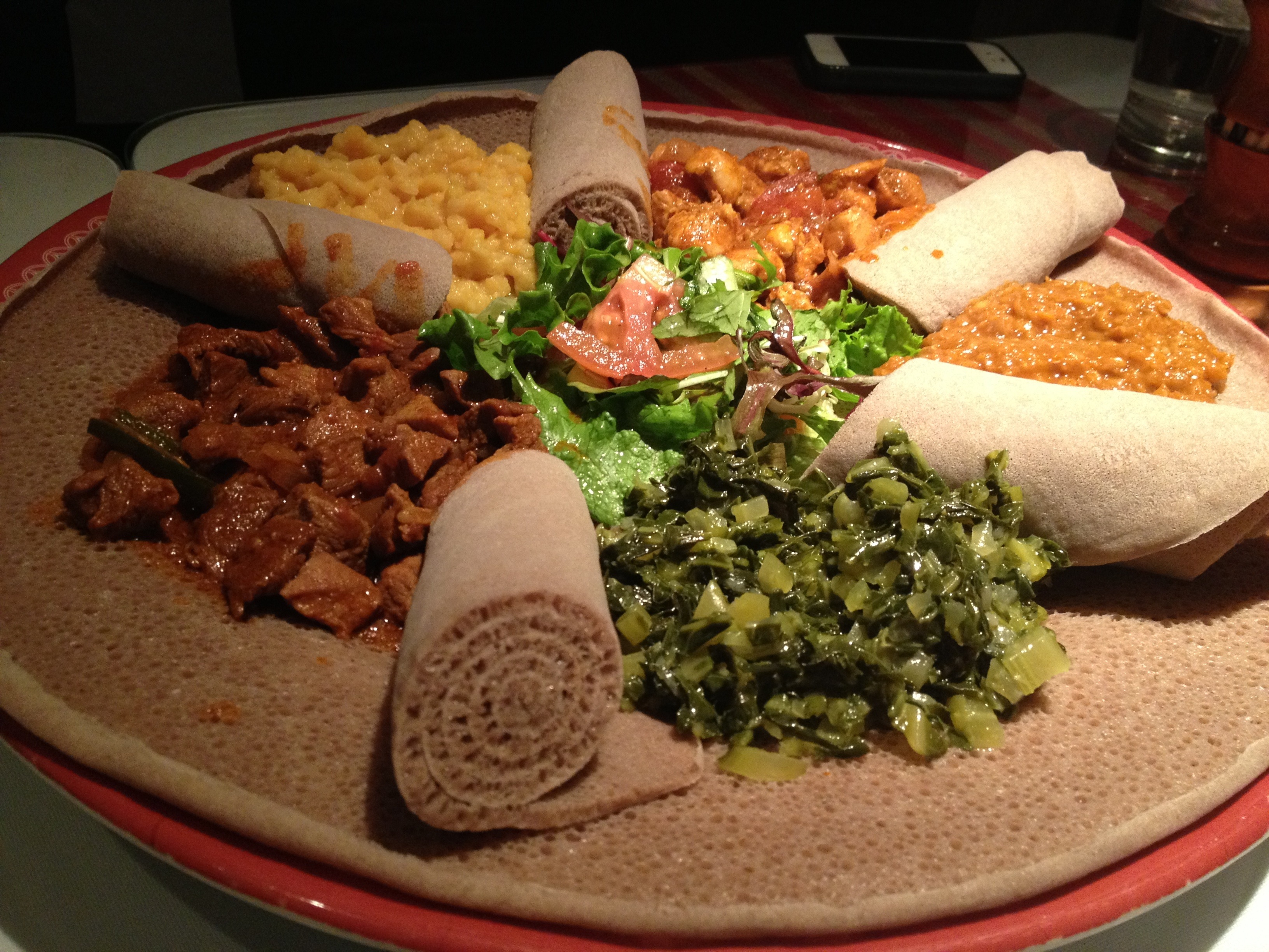 A few of us shared the signature Pero Platter which had lamb, chicken in red sauce, three vegetarian dishes and a green salad in the middle. In Ethiopian culture food is not eaten with forks and knives. Instead, Injera a spongey type of flat bread is used to pick up food. It was really interesting because it soaked up the aromatic sauces of all the food. Everything was pretty delicious. The Timitimo Tsebhi, a yellow lentil stew thing had a nice creamy texture, the chickpeas were eaten up right away and the chicken and lamb were delectable. Plus, who wouldn’t like a plate or utensil that could be eaten?