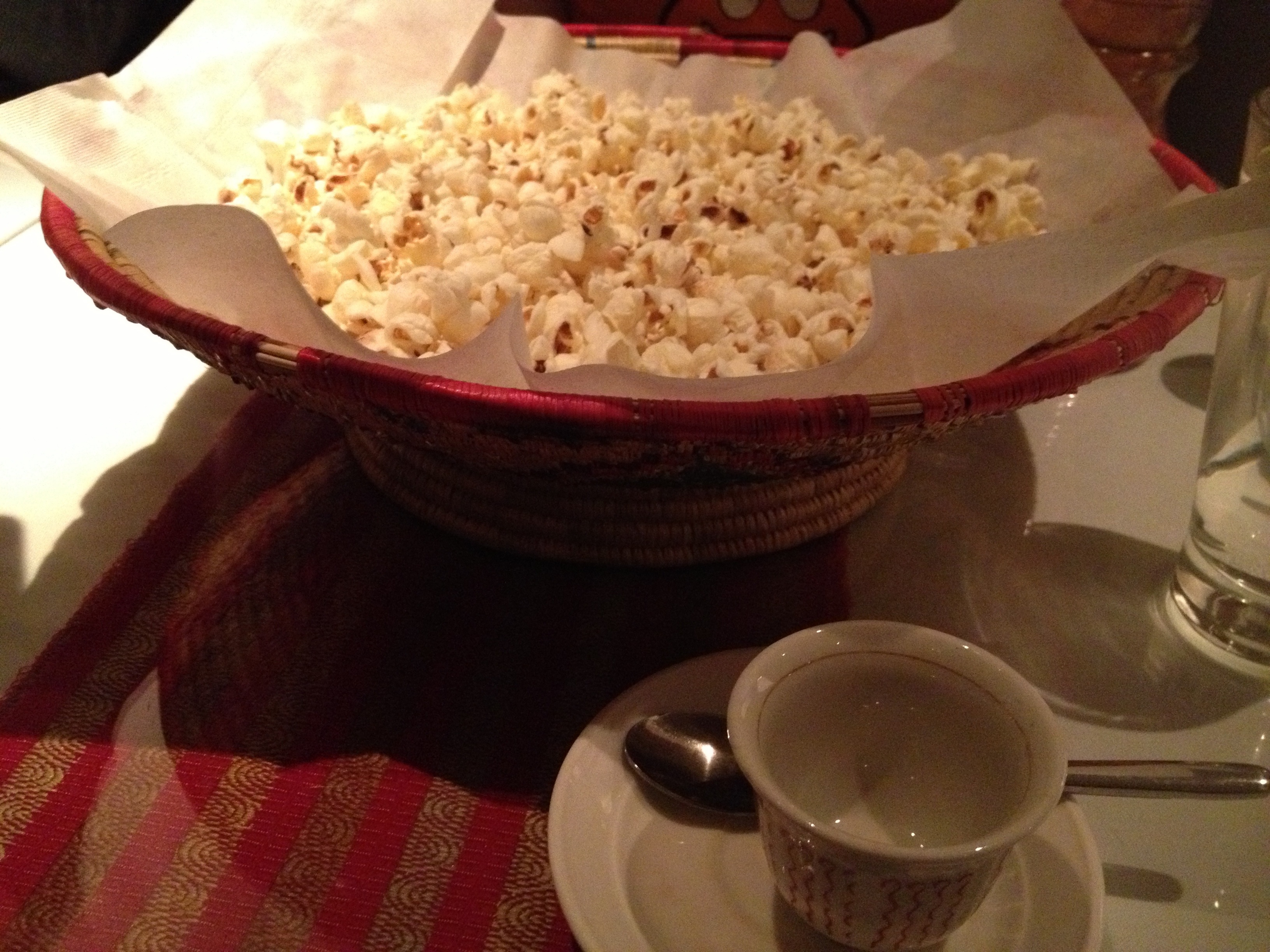 I had heard about the traditional Ethiopian coffee ceremony before and I thought since we were at a restaurant it would only be appropriate. The ceremony took couple of stages. First the beans were roasted and the host teased us (and the entire restaurant) with the fumes. While we waited for the beans to be crushed and turned into coffee, we had popcorn. I asked the host if he knew the origin of why Ethiopian’s use popcorn and he did not know. However he explained that when it is someone’s birthday they often put a type of bread on it. So, I pointed out that we were celebrating my birthday….