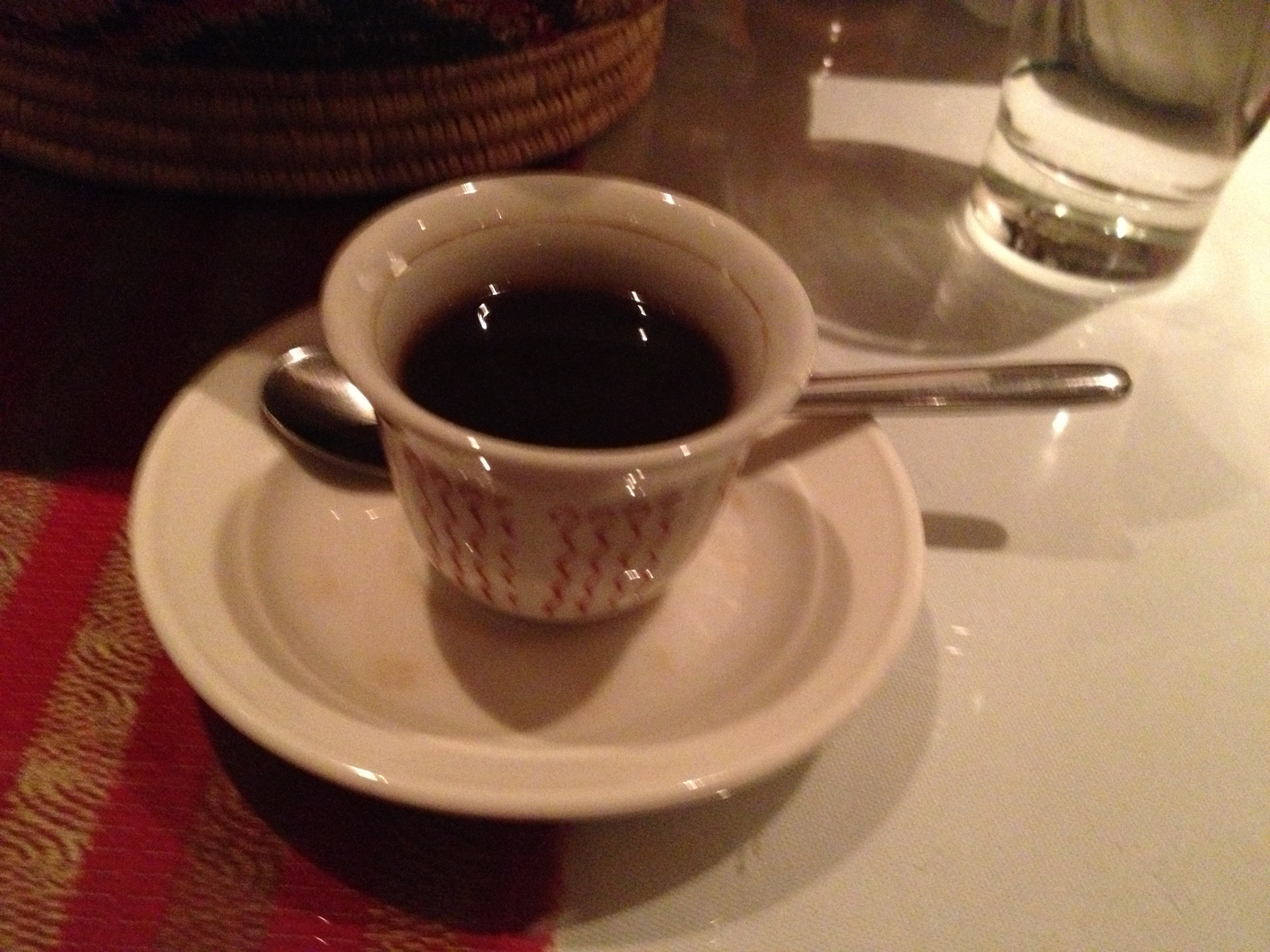 Then the coffee came and was served in little tiny cups. I drank it black and it wasn’t as bitter and strong as I expected it to be. Apparently it had quite a bit of caffeine because I drank two little cups and now I’m still up at 1:33am writing this post (after some alcohol and a long ride home). Anyways, for the price, the amazing service and exciting but tasty food, I am totally coming back.