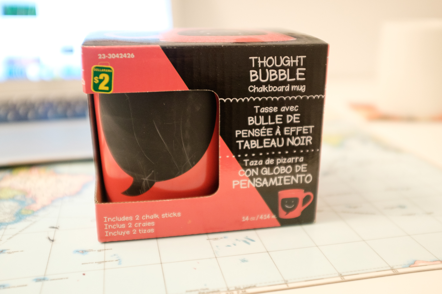 I found this adorable mug at Dollarama that has a mini chalkboard on it. For $2, it came with 2 white pieces of chalk that allowed me to write a message on my cup of joe.