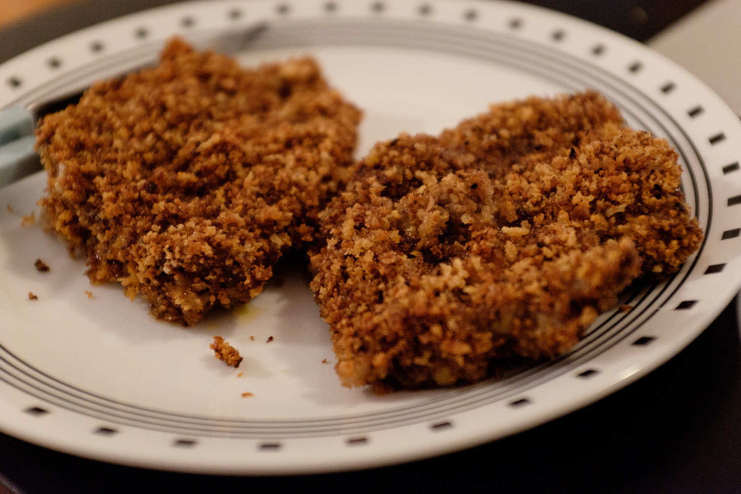The recipe we use is a super simple baked one. We learned that it’s best to cook panko bread crumbs until they are a golden brown. We then flavour the pork with simple salt and pepper. You can experiment with other spices if you want to go beyond the traditional style. The pork is then dipped in flour, egg and the golden panko and put in the oven at 400 degrees Fahrenheit for 20 minutes.