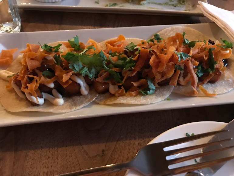 I had the pork belly tacos with hoisin jus, onion jam, crispy carrot chips and orange crema. It was an interesting combination of sweet and savory.