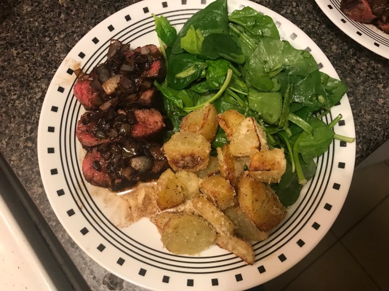 On my recent Chef’s Plate order I made a Seared Steak & Balsamic Shallot Jam with a spinach salad and parmesan potatoes.