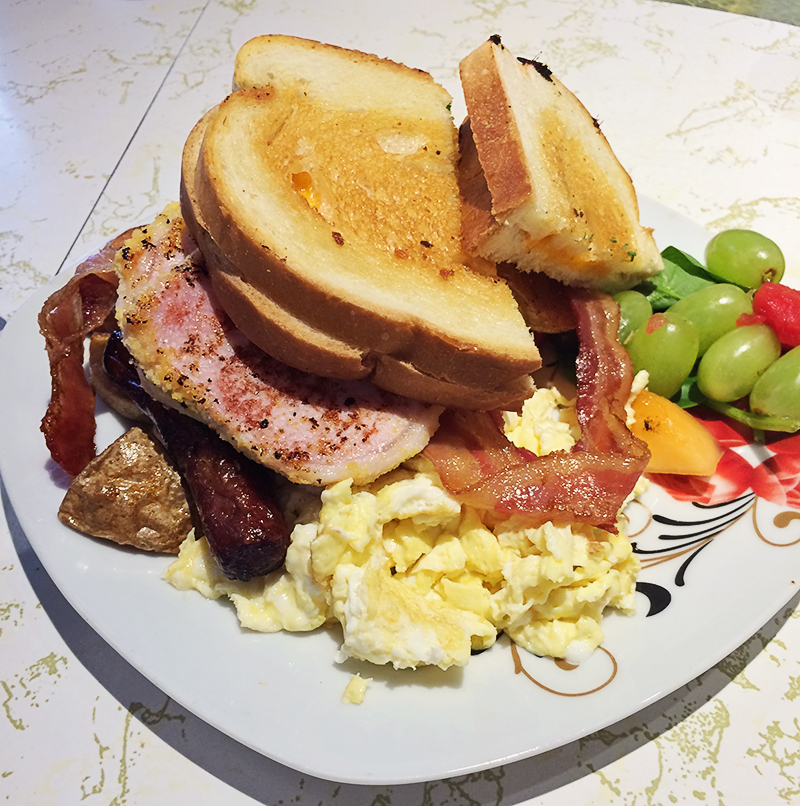 This morning I had brunch at Queen Street Warehouse. It is the second restaurant in Toronto to be offering a menu where all food items are $4.95 all day everyday. Interestingly they sustain this through company sponsorships. A Redbull logo could be seen in the corner of the restaurant but I actually didn’t feel like I was being blatantly advertised to that much. The servers were all dressed like 80s rockers and the sign to the bathroom said “Free Air Guitar”. It was corny but worked for the type of establishment that catered to young university students on a budget.