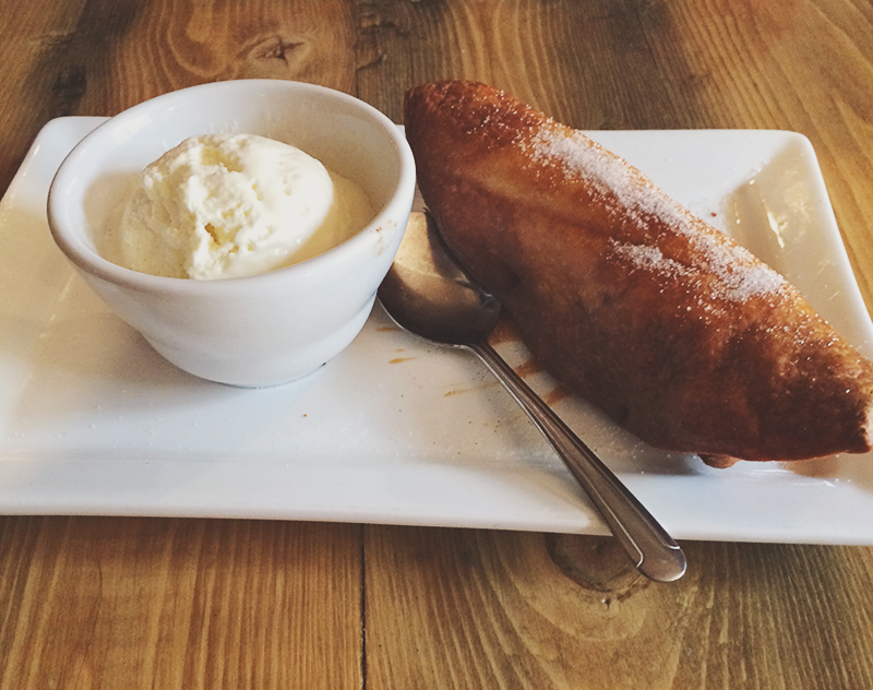 I couldn’t resist getting dessert (since again it was $4.95) so I ordered the Fried Apple Pie which was served with a side of vanilla ice cream. The shape made me think of what it would look like if someone took a MacDonald’s Apple Pie and fried it. The filling was way better than a McDonald’s pie though, it was hot and fresh. The outside was crunchy with a thick breading. It was a bit messy to eat but worth getting my hands dirty.