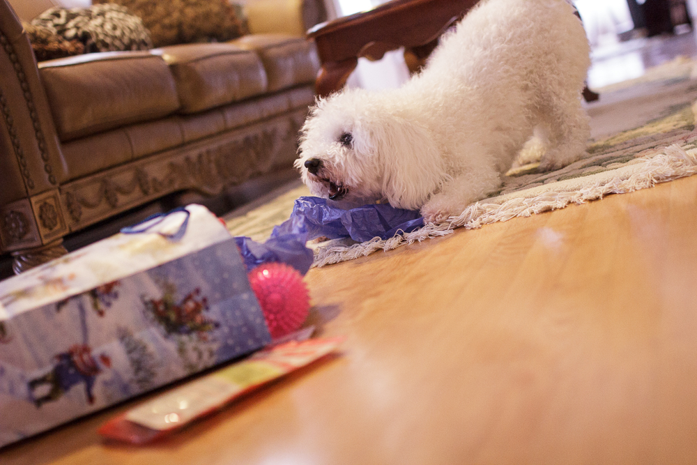 Merry Christmas! Teddy was probably the one with the most presents to unwrap on Christmas day. He has been waiting patiently for them ever since we put them under the tree. He’d stare at them every day but was nice enough not to touch them until Christmas morning. Here are some random photos of him digging into his presents.