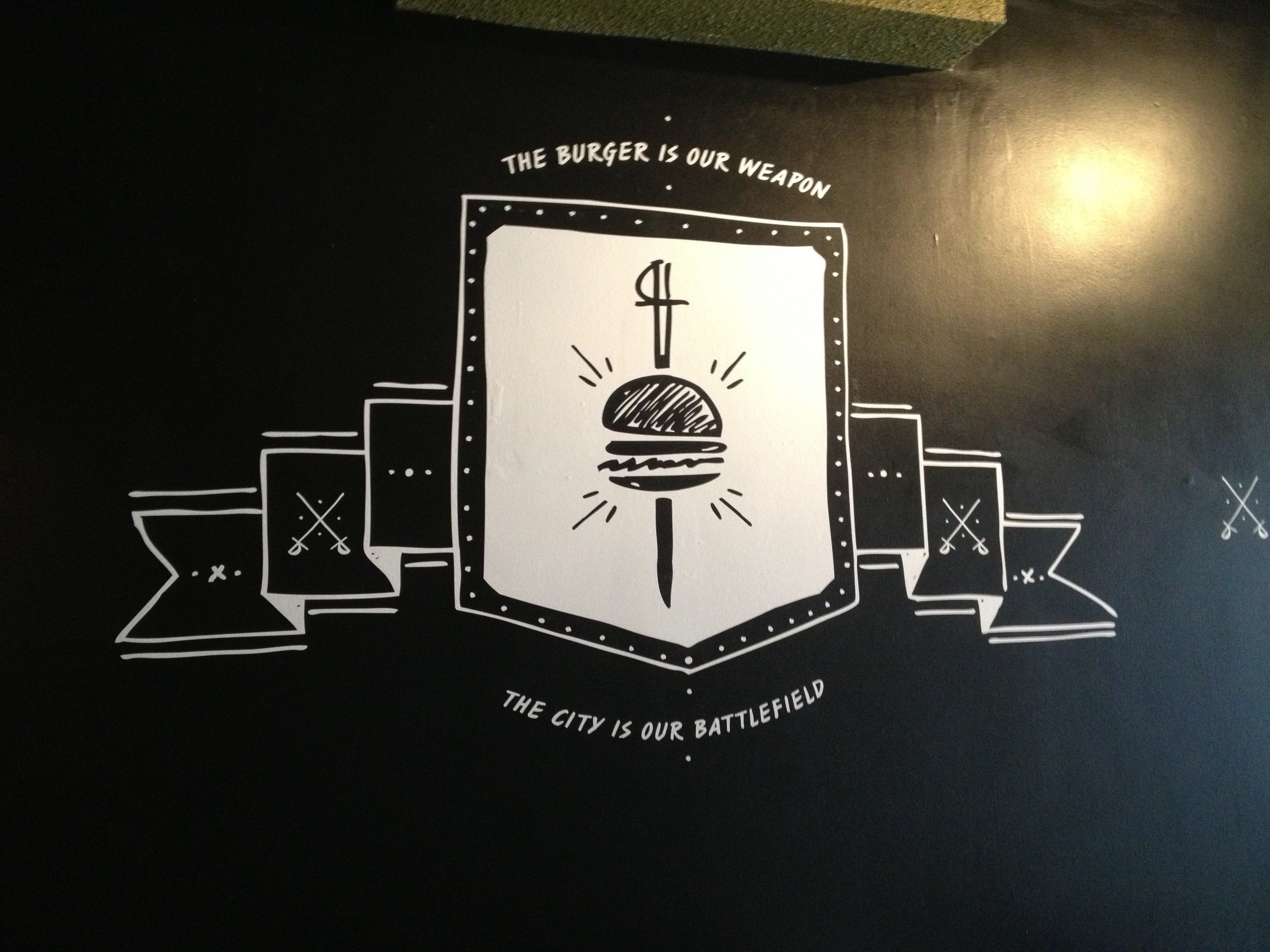 The washroom played along with a sign that says “Duty Calls” and a Burger Manifesto took up one wall.