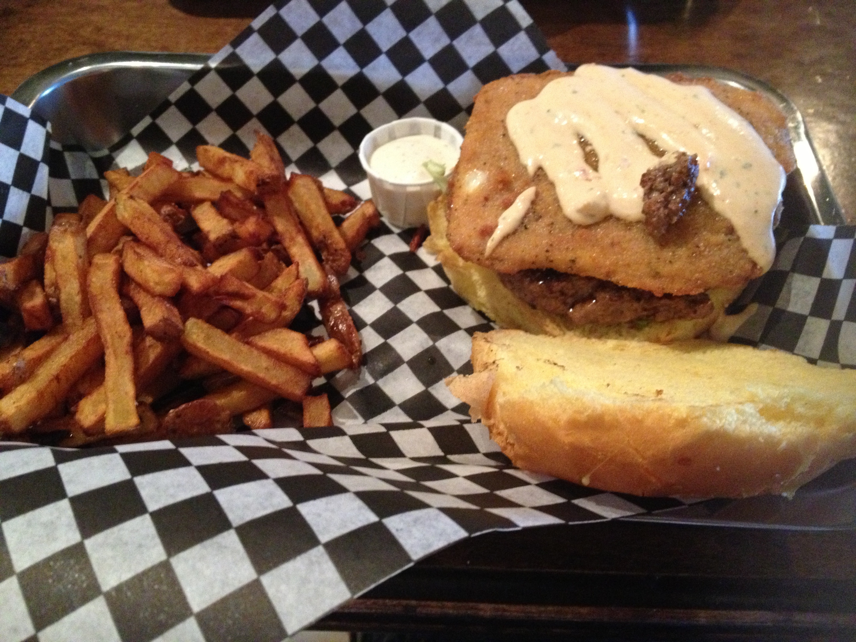 Nash had the Aristotle burger which was a lot like a Greek salad on a burger. His sweet potato fries came with BBQ sauce.
