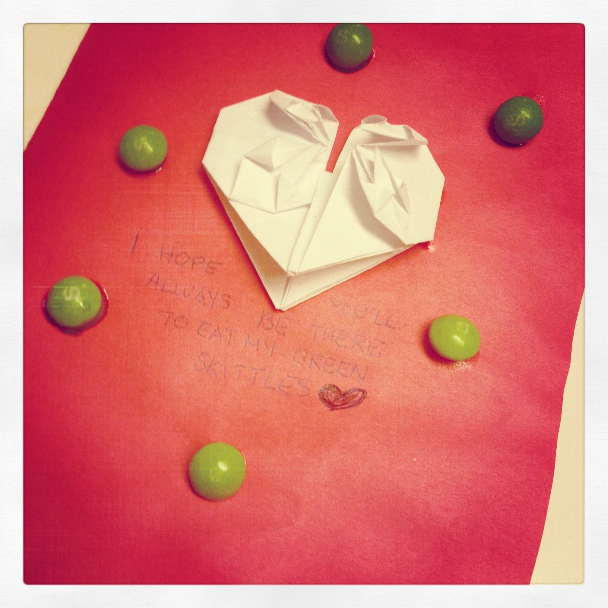 The paper heart was inspired by this love note pin. The skittles represent a chapter in the beginning of our relationship. Before we dated, when we had just started talking, I was eating a pack of Skittles and told him I hated the green ones. I also blurted out that I would love the boy who would eat my green Skittles. He told me he liked green Skittles. It’s funny because we had not even thought of each other as date-able material at that point but it’s one of our first memories as friends.